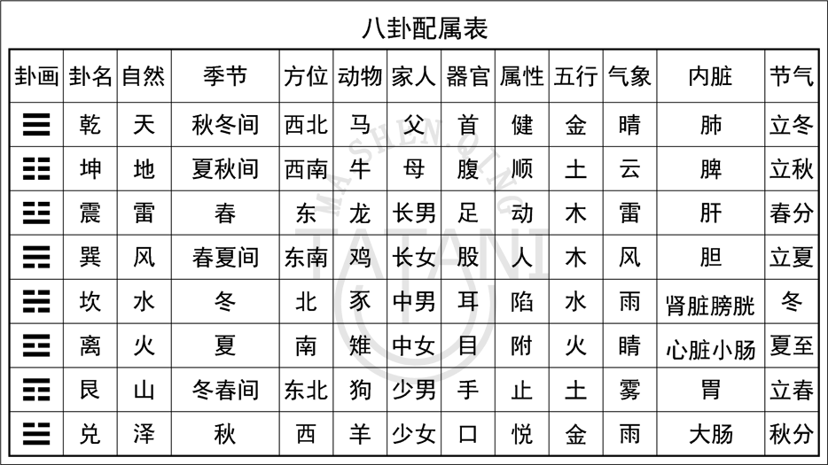 八卦 《大游年歌》(這個千萬別死記,是寫復(fù)雜、弄亂順序用來顯示高深的騙人的,記‘游年六字訣’可以了,除非你喜歡唱這類歌;),《大游年歌》如下: 乾:六天五禍絕延生 坤:天延絕生禍五六 震:延生禍絕五天六 巽:天五六禍生絕延 坎:五天生延絕禍六 離:六五絕延禍生天 艮:六絕禍生延天五 兌:生禍延絕六五天 八卦 游年六字訣:“生絕禍,五六天;” 全句是:‘伏生絕禍,延五六天;’但沒有人這樣讀,原口訣的解釋是:兩卦不變是伏位(伏位)都是那個位置,可以不理;上變生氣,中變絕命,下變禍害;全變延年(全變不用記);后句:上中變五鬼,上下變六煞,中下變天醫(yī); 口訣如何用:下面給你舉個例子,這樣你就明白上圖的吉兇位置,是如何算出來了;算這個要用后天(文王)八卦,例如坐北朝南,北方是“伏位”,也是坎位,卦畫中“斷”為陰爻,后面以“0”代替;“連”為陽爻,后面以“1”代替;卦畫是010,東邊是震位001,與坎卦放到一起,第一個都是0,第二、第三變了,轉(zhuǎn)過來就是中下變了,是“天醫(yī)”;西面為兌卦卦畫是011,與坎卦010,最后一條變了,西面是“禍害”;東北為乾卦111,與坎卦010,變了第一和第三條,此位是“六煞”! |