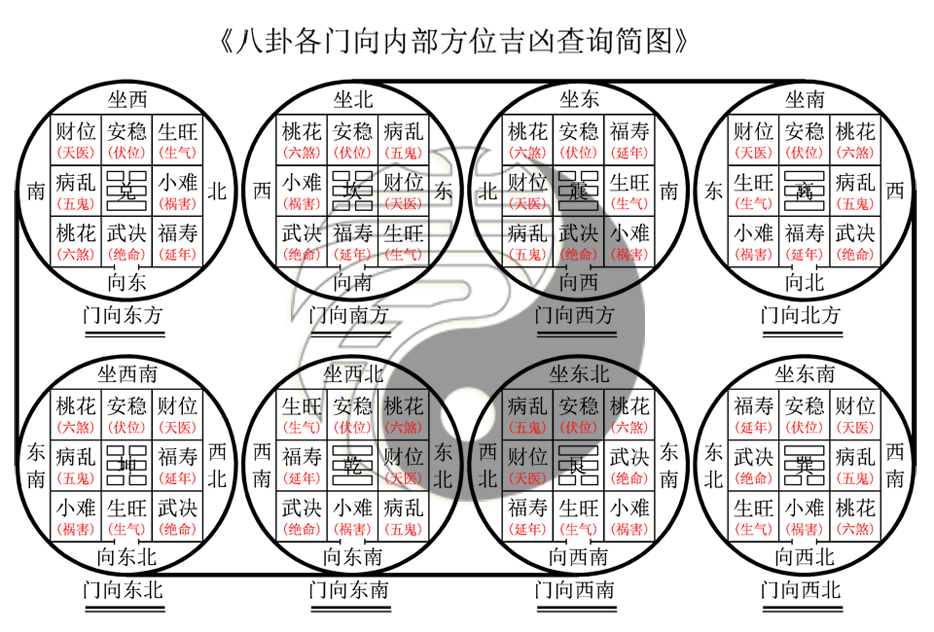| 關(guān)于八卦中門還有個歌訣:“東西正門是絕命,南北中前是延年,東北西南迎生氣,西北東南禍害臨!” | |||||||||