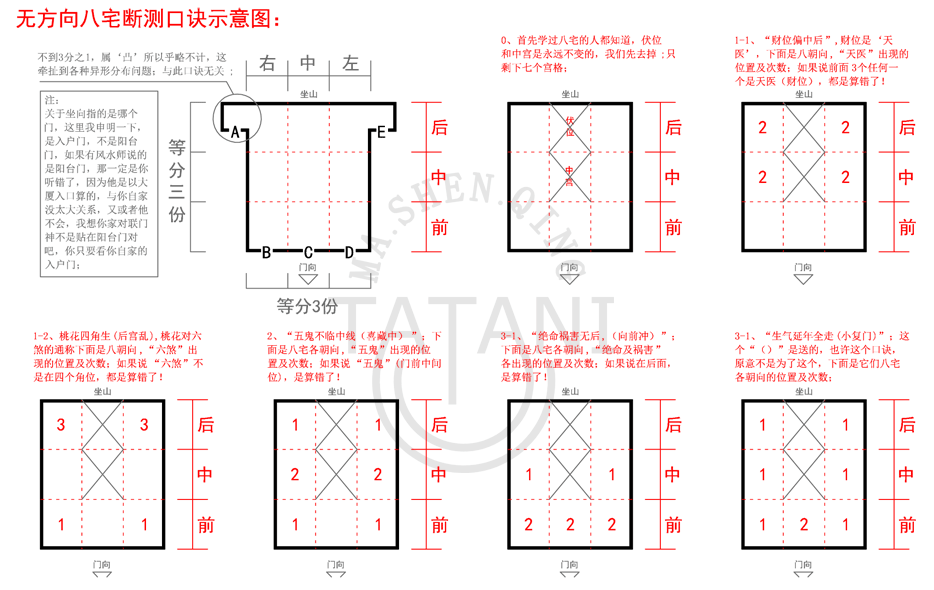 | 無方向八宅斷測歌訣:“財位布中后,四角桃花生(后宮亂);五鬼不臨中門(喜藏中);絕命禍害無后(向前沖);” | |||||||||